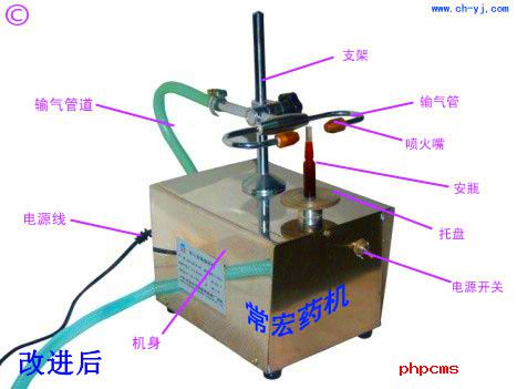 傳統的安瓿瓶熔封機,由控(kòng)製箱和熔封台兩部分組成,在長期使用中發現有如下缺點:準備時需要臨時接插(chā)助燃氣泵管;控(kòng)製箱和熔封台(tái)擺放(fàng)調節不方便;使用完畢須拔去氣管,再分兩部分提(tí)拿、搬動、收存。重複使用(yòng)時,容(róng)易出現:控製台和熔封台配套混亂,接(jiē)插不順,火焰調整不穩,丟失零配件情況。為此,我們將兩體機改進為一體機,助然氣泵管已事先接插好,使用時,隻需接通(tōng)煤(méi)氣或石油液(yè)化汽,調整煤氣和助燃氣開關,即可得到(dào)均勻集中的火焰。加熱安瓿時,可緩慢旋轉圓形安瓿擺放平台,使瓶頸加熱均勻,待軟(ruǎn)化時(shí),用鑷子將安(ān)瓿瓶頸上端(duān)往上拉斷,安瓿瓶頸下方即可光滑熔封。