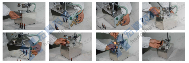6、按安瓿瓶放(fàng)置托盤上,先不要馬上放進火(huǒ)焰裏,首先要看火焰是否處於托盤中心點,以及是否處在你所需要熔封高(gāo)度(隻需鬆開支架上(shàng)的一個旋扭就可以任意選擇,而後旋緊)