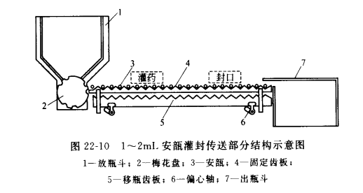 1一2ml-安瓿灌封機(jī)傳送部分(fèn)如圖22—10所示。洗淨(jìng)滅菌的安瓿由人工放人與水平成45。傾角的放料鬥上,料鬥下梅花(huā)盤由(yóu)鏈條帶動,每轉1/3周,可將2隻安瓿(bù)推人固定齒板上。固定齒板是上、下兩條呈三角形的齒板,安瓿上、下端分別擱放在其三角形槽中而固定,安瓿與水平依然成45。角。此時偏心軸作(zuò)圓周旋轉,帶動與之相連的移瓶齒(chǐ)板動作,移瓶齒板也是由上、下兩條與固定齒間距相同的齒形板組成,但其齒形(xíng)為橢圓形。當隨偏心軸作圓周(zhōu)運動(dòng)的移(yí)瓶齒板動作到(dào)上(shàng)半部,先將安瓿從固定齒(chǐ)板上托(tuō)起,然後(hòu)超過(guò)固定齒板三角形槽的齒頂,再將安瓿移動兩格放入固(gù)定齒板上(shàng),偏心軸轉動一周,安瓿(bù)通過(guò)移(yí)瓶齒板向前移兩格,這樣安瓿不斷前移通過灌藥和封口區域。偏心軸帶(dài)動移瓶齒板運送安瓿的時間(包括(kuò)托瓶、移瓶和(hé)放瓶)大約(yuē)為偏(piān)心軸轉1/3周,餘下的2,3周時間(jiān)供安瓿在固定齒板上(shàng)停留,這段時間將用來灌藥和封口。